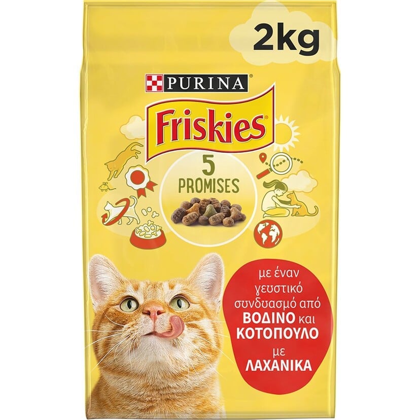 FRISKIES βοδινό, κοτόπουλο & λαχανικά 2kg Περιγραφή Ξηρή Τροφή Γάτας. Οι γάτες είναι εξερευνητές από τη φύση τους, αντιλαμβάνονται τα πάντα στο περιβάλλον τους. Αυτό είναι που τις κάνει τόσο γοητευτικά και ενεργά μέλη της οικογένειας. Γι' αυτό οι ειδικοί της Purina® έχουν δημιουργήσει τα Friskies® για ενήλικες γάτες: νόστιμη, ποιοτική τροφή για γάτες, που θρέφει το αστείρευτο ενδιαφέρον του εξερευνητή σας για τον κόσμο. Τα Friskies® διατρέφουν γάτες με σωστή, υγιεινή τροφή για δεκαετίες. Γεμίζουμε χιλιάδες μπωλ και αυτή η τιμή συνοδεύεται από τεράστια ευθύνη. Γι' αυτό οι συνταγές Friskies® παρασκευάζονται χωρίς πρόσθετες τεχνητές χρωστικές, αρωματικές ύλες ή συντηρητικά. Για να μπορείτε να συνεχίσετε να τις διατρέφετε με την ίδια νόστιμη τροφή που αγαπούν και να νιώθετε περήφανοι γι' αυτό. Χωρίς Πρόσθετες Τεχνητές Χρωστικές, Αρωματικές ύλες ή Συντηρητικά. Συστατικά Πλήρης τροφή για ενήλικες γάτες. Σύνθεση: Δημητριακά,Κρέας και ζωικά παράγωγα (20%, εκ των οποίων 2% βοδινό και 2% κοτόπουλοσε δισκοειδείς κροκέτες και κροκέτες σε σχήμα φιλέτο*), Εκχυλίσματα φυτικών πρωτεϊνών, Έλαια και λίπη, Παράγωγα φυτικής προελεύσεως, Ανόργανα άλατα, Ζύμες, Λαχανικά (0.6% αφυδατωμένα λαχανικά, ισοδύναμο με 4% ανασυσταμένα λαχανικά σε κροκέτες σε σχήμα τριπόδου**), . *Συνολική περιεκτικότητα προϊόντος: 1.5% βοδινό και 1.5% κοτόπουλο **Συνολική περιεκτικότητα προϊόντος: 1% ανασυσταμένα λαχανικά Τυπική σύνθεση προϊόντος: δισκοειδείς κροκέτες και κροκέτες σε σχήμα φιλέτου 75%, κροκέτες σε σχήμα τρίποδου 25%. Πρόσθετα: Διατροφικά πρόσθετα: IU/kg: Βιτ Α: 12 500; Βιτ D3: 1 000; Βιτ Ε: 85; mg/kg: Μονοένυδρος θειικός σίδηρος: (Fe: 47); Άνυδρο ιωδικό ασβέστιο: (I: 1.5); Πενταένυδρος θειικός χαλκός: (Cu: 8.9); Μονοένυδρο θειικό μαγγάνιο: (Mn: 5.1); Μονοένυδρος θειικός ψευδάργυρος: (Zn: 66); Σεληνιούχο νάτριο: (Se: 0.1); Ταυρίνη: 870. Χρωστικές(1) και αντιοξειδωτικά (1)χωρίς τεχνητές χρωστικές. Αναλυτικά Συστατικά: Πρωτεΐνη: 30%, Περιεκτικότητα σε λιπαρές ουσίες: 11%, Ακατέργαστη τέφρα: 8%, Ακατέργαστες διατροφικές ίνες: 3%, Απαραίτητα λιπαρά οξέα: 1,8% Αλλεργιογόνα