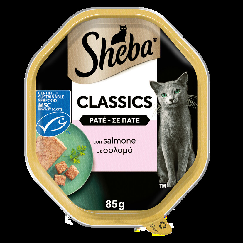 SHEBA® δισκάκι με σολομό σε πατέ 85g. Τα δισκάκια SHEBA® είναι φτιαγμένα με ιδιαίτερη φροντίδα και προσοχή στη λεπτομέρεια. To SHEBA® έχει δημιουργήσει μια συλλογή από απολαυστικές συνταγές πατέ που θα ενθουσιάσουν τη γάτα σας. Τα δισκάκια SHEBA® αποτελούν υψηλής ποιότητας πλήρης τροφή για ενήλικες γάτες. Η νόστιμη αυθεντική γεύση του SHEBA® επιτυγχάνεται χωρίς τεχνητά αρώματα, χρωστικές και συντηρητικά.