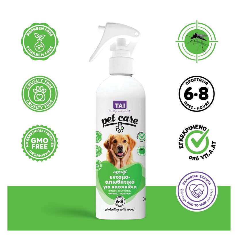 Με εμπειρία στα εντομοαπωθητικά από το 1989, η TAI | the honest company ενισχύει την γκάμα των εντομοαπωθητικών και εντομοκτόνων προϊόντων της με την παρουσίαση του νέου κωδικού: TAI PET CARE SPRAY που έχει έγκριση από το ΥΠΑΑΤ βάση κανονισμού εντομοαπωθητικών προιόντων και κανονισμού ΕΕ 528/2012 βιοκτόνων προιόντων