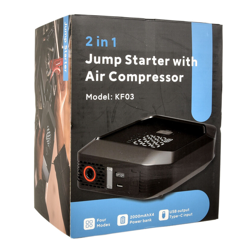 2 σε 1 Ισχυρός Εκκινητής Μπαταρίας (Jump Starter) & Φορητός Αεροσυμπιεστής Ελαστικών Χαρακτηριστικά Συμβατότητα: Για οχήματα βενζίνης & πετρελαίου 12V Ρεύμα εκκίνησης: 400A Ρεύμα αιχμής εκκίνησης: 1000A Θερμοκρασία λειτουργίας: -10~45℃ Κλέμμα (σφιγκτήρας): 400A Ψηφιακή οθόνη με διπλή ένδειξη: Προκαθορισμένη πίεση & πίεση σε πραγματικό χρόνο Αυτόματη διακοπή όταν επιτευχθεί η προκαθορισμένη πίεση 5 έξυπνες λειτουργίες: Ποδήλατο / Μοτοσυκλέτα / Αυτοκίνητο / Μπάλα / Χειροκίνητο Εναλλαγή μονάδων μέτρησης: Psi, Kpa, Bar, Kg/cm² Μέγιστη πίση αέρα: 160PSI Διάμετρος κυλίνδρου: 19mm Ροή αέρα: 26–28L/λεπτό Φωτισμός έκτακτης ανάγκης LED Λειτουργία power bank (φορητού φορτιστή) Ενσωματωμένη μπαταρία Li-polymer: 4×2000mAh