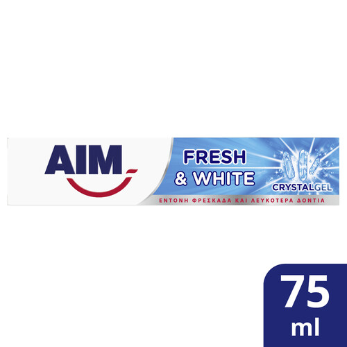 Έντονη φρεσκάδα και λευκότερα δόντια! Με την αποκλειστική της σύνθεση η Aim Crystal Gel Fresh & White πέρα από την αποτελεσματικότητά της ΑΙΜ συνδυάζει: Gel με έξτρα δροσερή γεύση μέντας για έντονη και μεγάλης διάρκειας αίσθηση φρεσκάδας. Μικροσωματίδια στίλβωσης, ταοποία χαρίζουν απαλά λάμψη στα δόντια σας, για να αναδείξουν τη λευκότητα του χαμόγελού σας.