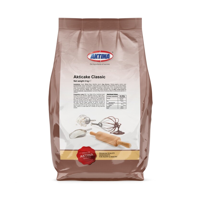 Το Akticake Classic της AKTINA είναι ένα μείγμα για την παρασκευή κέικ λαδιού με γεύση βανίλια ή σοκολάτα, κατάλληλο και για μάφινς. Διατίθεται σε συσκευασία των 2 κιλών.