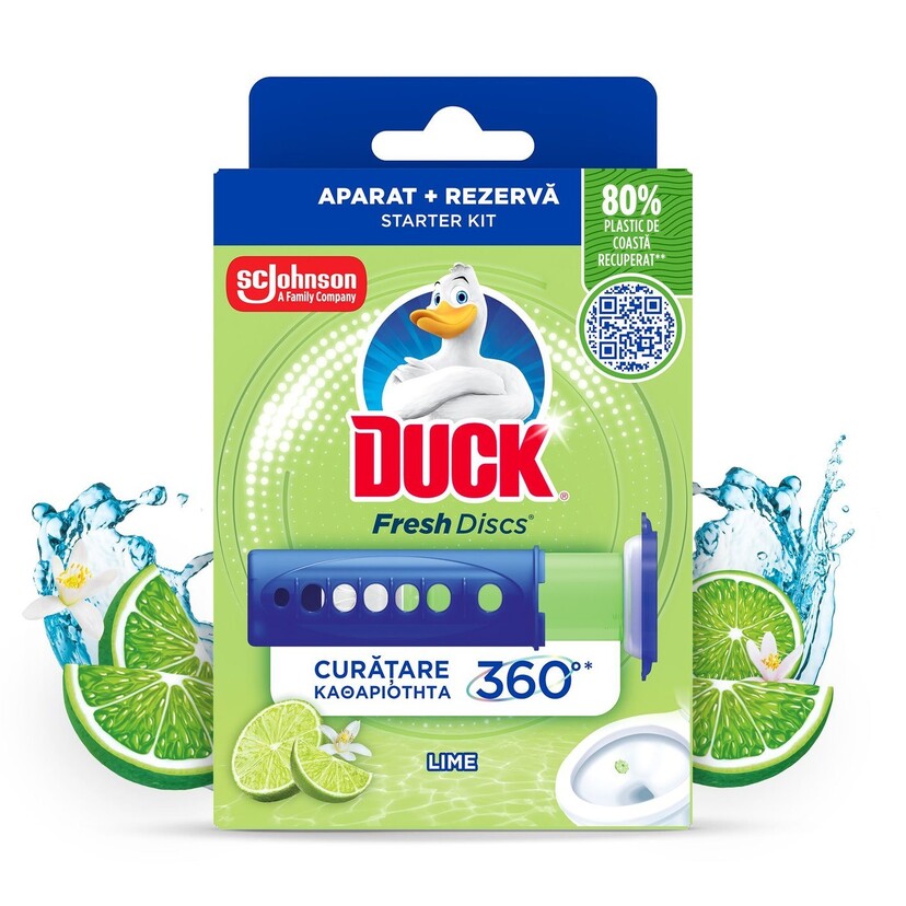 DUCK καθαριστικό λεκάνης τουαλέτας Fresh Discs Lime χωρίς θήκη 36ml Περιγραφή Η σύνθεση τωνDUCK® Fresh Discs® αφήνει, κάθε φορά που τραβάτε το καζανάκι, ένα προστατευτικό φιλμ σε ολόκληρη τη λεκάνη το οποίο βοηθά να αποτραπεί η συσσώρευση των αλάτων. Πλαστικό που έχει περισυλλεχθεί από τη ξηρά, εντός απόστασης 50km από τον ωκεανό προκειμένου να μην καταλήξει στον Ωκεανό ή σε χώρους υγειονομικής ταφής. Η χειρολαβή περιέχει 98% πλαστικό που περισυλλέγεται σε παράκτια περιοχή, το ανταλλακτικό 84% και το καπάκι 0%. Οδηγίες χρήσης ΟΔΗΓΙΕΣ ΧΡΗΣΗΣ - Σιγουρευτείτε ότι η λεκάνη είναι καθαρή 1. Ευθυγραμμίστε το μεγάλο κουμπί του δοχείου gel με τις τρύπες της χειρολαβής. Αφαιρέστε το καπάκι και κρατήστε το. 2. Τοποθετήστε το στόμιο του δοχείου gel στο εσωτερικό της λεκάνης σε σημείο όπου υπάρχει ροή νερού όταν τραβάτε το καζανάκι. 3. Πιέστε και κρατήστε το κουμπί καθώς σπρώχνετε τη χειρολαβή προς το τοίχωμα της λεκάνης έως ότου το κουμπί να κουμπώσει στην αμέσως επόμενη τρύπα. Μην το περιστρέφετε. Τραβήξτε τη χειρολαβή προς τα πίσω για να αφήσετε ένα δισκίο gel. Κλείστε καλά το δοχείο gel με το καπάκι. Τραβήξτε το καζανάκι για να ενεργοποιήσετε το δισκίο. Μετά την εφαρμογή του, το δισκίο gel ενδέχεται να προσελκύσει την περιέργεια μικρών παιδιών. Εφαρμόστε το προϊόν μέσα στη λεκάνη, σε σημείο όσο το δυνατόν λιγότερο ορατό από τα παιδιά. Κατάλληλο για σηπτικούς βόθρους.