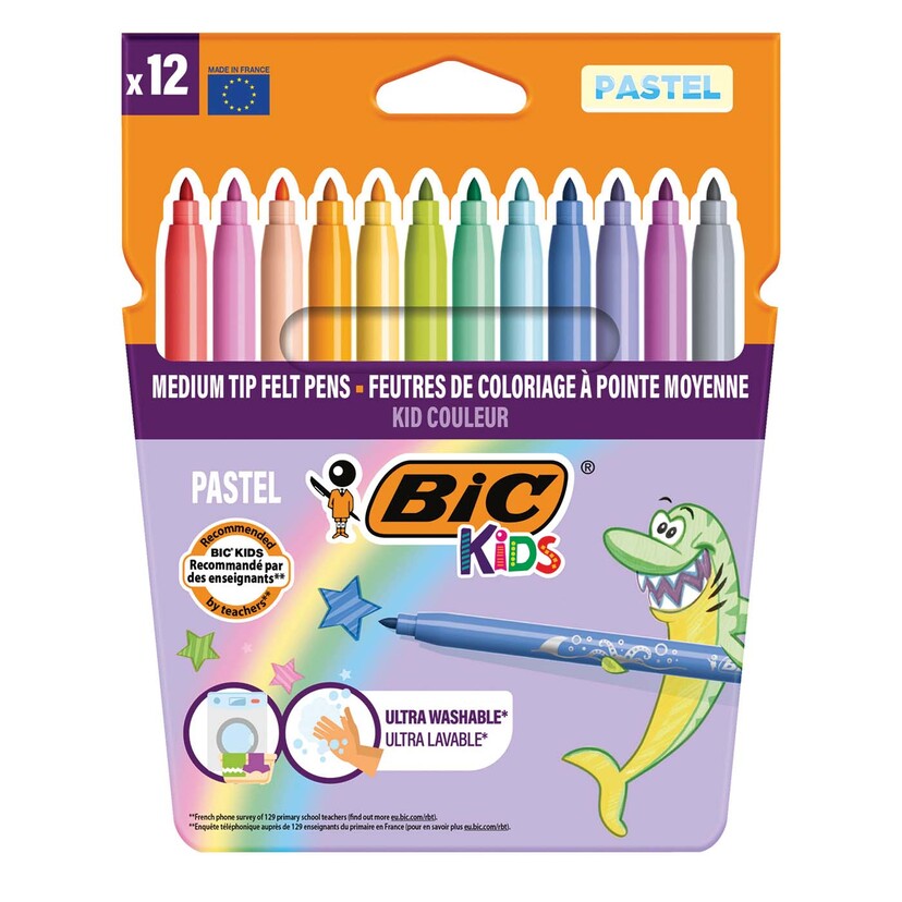 Η σειρά προϊόντων BIC Kids προσφέρει σύνεργα ζωγραφικής ειδικά σχεδιασμένα για να βοηθήσουν τα παιδιά να μεγαλώσουν με ασφάλεια. Οι μαρκαδόροι Kid Couleur είναι σχεδιασμένοι για τα καθημερινά έργα των παιδιών ηλικίας 5 ετών και άνω. Κυκλοφορούν σε 12 φωτεινά χρώματα για σχέδια υψηλής αντίθεσης που μοιάζουν να ζωντανεύουν στο χαρτί. Με μια σταθερή μύτη μεσαίου πάχους που δεν λυγίζει με την πίεση, μπορούν να χρησιμοποιηθούν τόσο για περίπλοκο σχεδιασμό όσο και για χρωματισμό μεγάλου όγκου. Μην φοβηθείτε αν τα παιδιά λερωθούν, αυτοί οι μαρκαδόροι ξεπλένονται εύκολα από το δέρμα και τα περισσότερα υφάσματα.