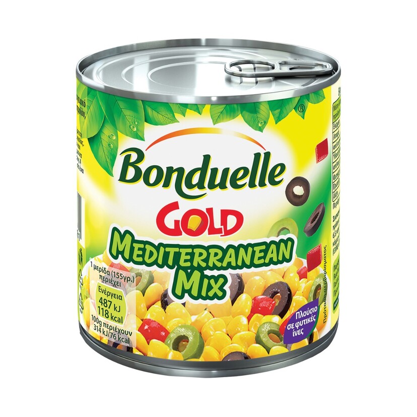 Το Bonduelle Mediterranean Mix είναι ένα μείγμα λαχανικών σε κονσέρβα, που συνδυάζει γλυκό καλαμπόκι, πράσινες και μαύρες ελιές, καθώς και κόκκινες πιπεριές, προσφέροντας μια αυθεντική μεσογειακή γεύση.