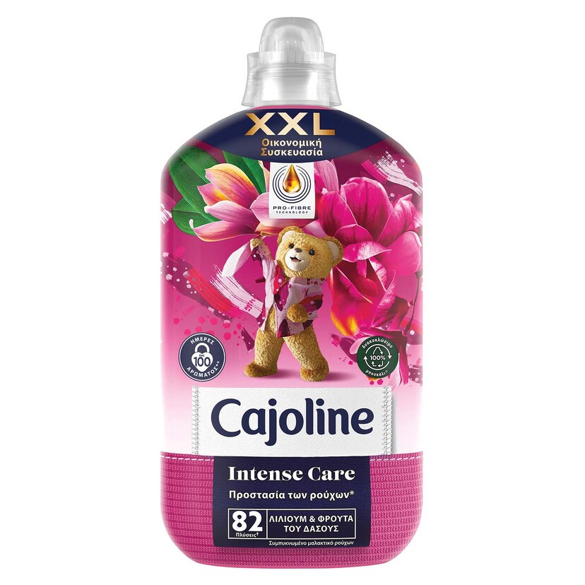 Το Cajoline Intense Care συμπυκνωμένο μαλακτικό ρούχων περιέχει την επαναστατική τεχνολογία PRO-FIBRE, η οποία εισχωρεί βαθιά στις ίνες των ρούχων και τα προστατεύει από τη φθορά που προκαλείται κατά την διάρκεια της πλύσης. Ολοκληρωμένη Προστασία των Ρούχων: Βοηθάει στη φροντίδα των ινών των ρούχων Βοηθάει στην προστασία των χρώματων Βοηθάει στη διατήρηση του σχήματος των ρούχων Άρωμα που διαρκεί Έως 100 ημέρες αρώματος* *Βάσει εργαστηριακής αξιολόγησης. Αποθήκευση στη ντουλάπα μετά από πλύσιμο. Αξιολόγηση του αρώματος μετά από ενεργοποίηση μικροκαψουλών.