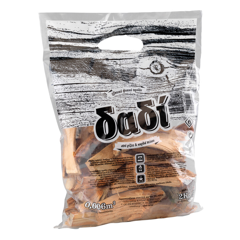 ΔΑΔΙ (ΣΑΚΟΥΛΑ 2kg ΦΥΣΙΚΟΥ πεύκου) Φυσικό προσάναμμα από τις ρίζες και καρδιές του πεύκου. Τοποθετώντας 3-4 κομμάτια δαδί, μαζί με ένα κύβο προσανάμματος στην βάση του τζακιού ή της σόμπας σας, βοηθάτε τα μεγάλα ξύλα να έχουν δυνατή φωτιά και να την διατηρήσουν για αρκετά λεπτά, ώστε η εστία της φωτιάς να παραμείνει δυνατή και να διατηρηθεί αρκετή ώρα. Παράλληλα, το ρετσίνι που είναι φυσικά εμποτιζόμενο στο δαδί, βοηθάει την καλύτερη και πιο ισχυρή καύση των ξύλων. Tέλος σας προσφέρει μία υπέροχη μυρωδιά του δάσους, που αναδύεται κατά την καύση του