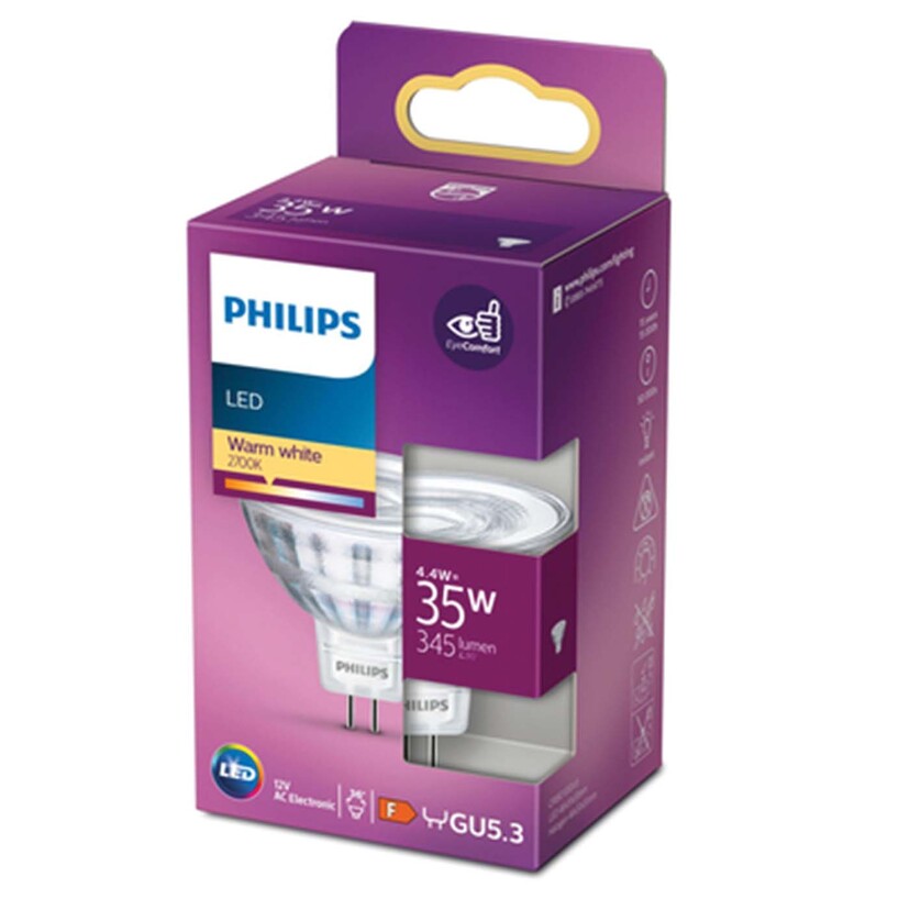 - Philips 8719514307629. Ισχύς λαμπτύρα: 4,4 W, Ισοδύναμη ισχύς λαμπτήρα: 35 W, Τοποθέτηση / καπάκι τύπου: GU5.3, Φωτεινή ροή: 345 lm, Διάρκεια ζωής λαμπτήρα: 15000 h, Χρώμα φωτός: Θερμό λευκό, Θερμοκρασία χρώματος: 2700 K, Πλάτος γωνία: 36°, Color Rendering Index (CRI): 80, Συντελεστής ισχύος: 0,6