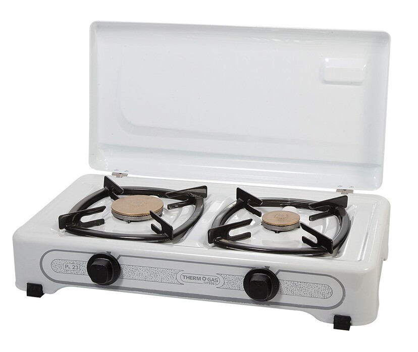 THERMOGAS εστία με 2 εστίες THERMOGAS εστία με 2 εστίες PN23 λέυκο τύπος κόυζινακι ύγραεριου-βόυτανιου-χάμηλης πίεσης έστιες 2 (μέγαλη, μέσαια) άλλα χάρ/κά σχάρες έστιας έμαγιε ίταλικες βάλβιδες ύγραεριου 2 δίαβαθμισεων μόντερνος κάι πρώτοποριακος σχέδιασμος έγγυηση 2 χρόνια