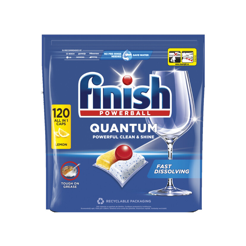 Οι ταμπλέτες Finish Quantum Powerball με άρωμα λεμονιού προσφέρουν κορυφαία καθαριότητα και αστραφτερή λάμψη στα σκεύη σας, ακόμα και στις πιο απαιτητικές συνθήκες πλύσης. Χάρη στη σύνθεσή τους “All in 1”, διαλύονται γρήγορα χωρίς υπολείμματα και απομακρύνουν αποτελεσματικά λίπη και ξεραμένα υπολείμματα τροφών, χωρίς την ανάγκη πρόπλυσης – εξοικονομώντας νερό.