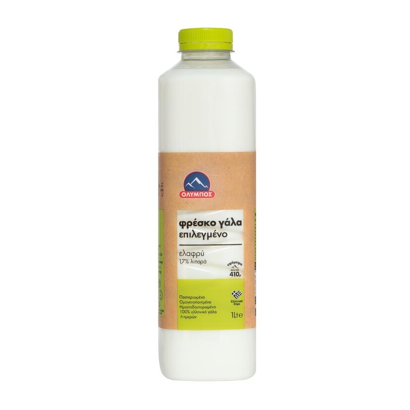 Το φρέσκο γάλα ΟΛΥΜΠΟΣ επιλεγμένο με λίπος 1,7% παράγεται από 100% ελληνικό φρέσκο γάλα. Το 100% ελληνικό φρέσκο γάλα ΟΛΥΜΠΟΣ επιλεγμένο συλλέγεται καθημερινά από επιλεγμένες φάρμες που βρίσκονται σε μικρές αποστάσεις από τις εγκαταστάσεις μας, σε υψόμετρο πάνω από τα 410m και πληροί αυστηρότερα στάνταρ από αυτά που προβλέπει η ευρωπαϊκή νομοθεσία. Αυτή η μοναδικότητα του είναι που μπορεί και κάνει το Φρέσκο Γάλα ΟΛΥΜΠΟΣ επιλεγμένο, σπάνιο.