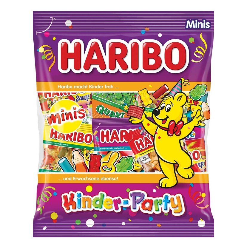 Το πάρτι μπορεί να ξεκινήσει. Το Haribo Children’s Party Minis είναι ένα πολύχρωμο μείγμα με ατομικά συσκευασμένα τσίχλα φρούτων και ανταύγειες αφρού ζάχαρης. Ανακαλύψτε πραγματικές στιγμές, όπως παιδικές πιπίλες, Quaxi, Gold Bears, Happy Cola ή Balla-Balla. Κάντε τα μάτια σας να αστράφτουν σε ελάχιστο χρόνο – είτε στα γενέθλια ενός παιδιού είτε στο επόμενο αποκριάτικο πάρτι.