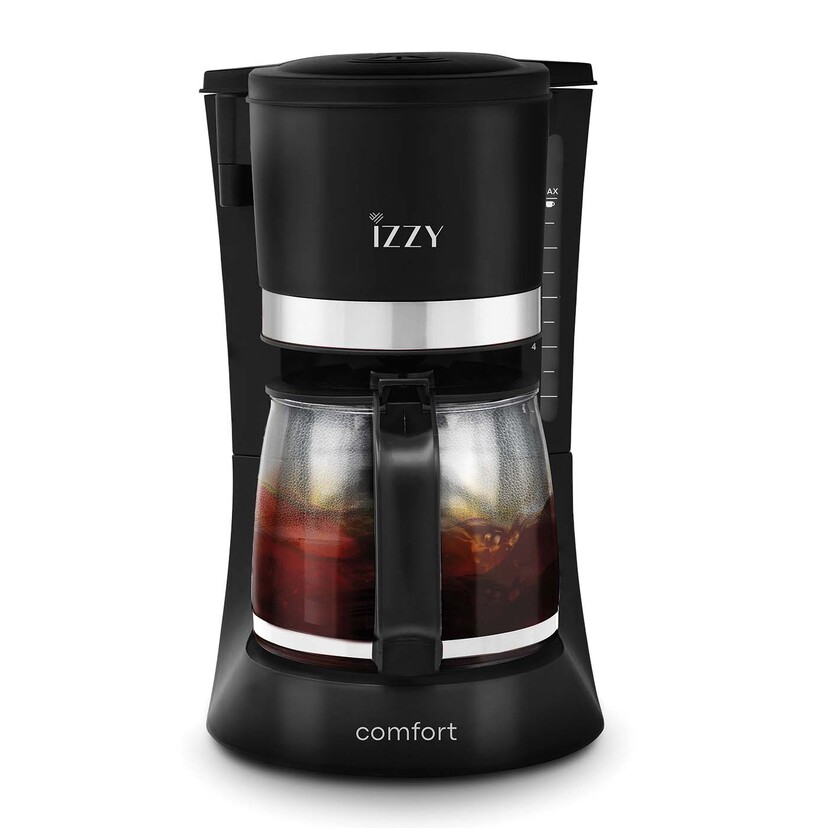 IZZY καφετιέρα φίλτρου Comfort IZ-6102 Μαύρη με inox λεπτομέρειες Έως 10 φλυτζάνια Γυάλινη κανάτα 1,25Lt Μόνιμο αφαιρούμενο φίλτρο Ένδειξη στάθμης νερού Τεχνολογία Anti-drip, για ασφαλή αφαίρεση της κανάτας Ασφάλεια κατά της υπερθέρμανσης Λυχνία λειτουργίας Κουτάλι / δοσομετρητής 900W