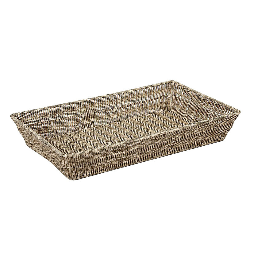 Ψάθινο καλάθι, σε διαστάσεις GN για γαστρονόμους, σε κλασικό μπεζ, για τον μπουφέ και όχι μόνο. Κατασκευασμένο από συνθετικό rattan, ανθεκτικό και κατάλληλο για επαγγελματική χρήση, θα σάς εξυπηρετήσει για να σερβίρετε κάθε πιθανή λιχουδιά ή για τα μαχαιροπήρουνά σας, παρουσιάζοντάς τα με τον πιο ευφάνταστο αλλά και πρακτικό τρόπο.