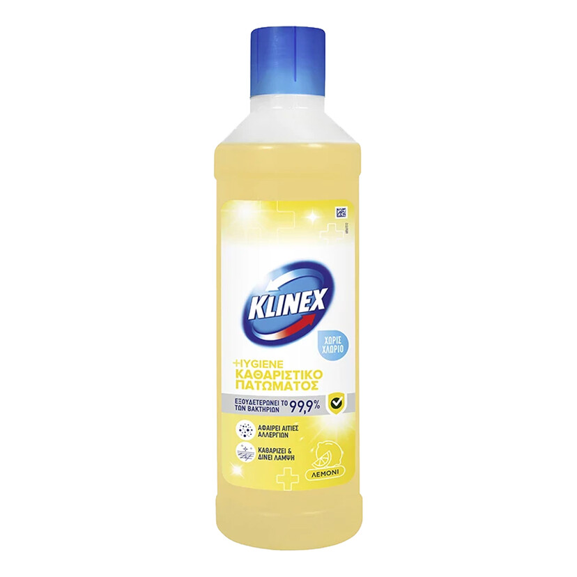 Το Klinex Hygiene Καθαριστικό Πατώματος Λεμόνι απολυμαίνει σε βάθος χωρίς χλώριο και αφήνει υπέροχο άρωμα φρεσκάδας που διαρκεί σε μικρές και μεγάλες επιφάνειες! Πιο συγκεκριμένα, η ειδική σύνθεσή του χωρίς χλώριο, εξουδετερώνει το 99,9% των βακτηρίων και τις αιτίες αλλεργιών και το καθιστά ιδανικό ακόμα και για καθημερινή χρήση. Με τα Klinex Hygiene Καθαριστικά Πατώματος, μπορείτε ναείστε σίγουροι ότι χαρίζετε υγιεινή καθαριότητα σεκάθε επιφάνεια και έτσι, να απολαμβάνετε το σπίτι σας κάθε στιγμή ξέγνοιαστα! * Βάσει εργαστηριακών τεστ ΕΝ. **Χρησιμοποιείτε τα βιοκτόνα προϊόντα με ασφαλή τρόπο. Διαβάζετε πάντοτε την ετικέτα και τις πληροφορίες σχετικά με το προϊόν πριν από τη χρήση.