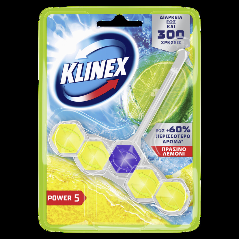 Το KLINEX WC Block Power 5 Πράσινο Λεμόνι 50g είναι ένα αποσμητικό τουαλέτας που συνδυάζει πέντε δράσεις σε μία χρήση, προσφέροντας καθαριότητα και φρεσκάδα σε κάθε χρήση. Κάθε φορά που τραβάτε το καζανάκι, απελευθερώνεται η ειδική σύνθεσή του, που αποτρέπει τη συσσώρευση αλάτων και διατηρεί την τουαλέτα σας υγιεινά καθαρή. Επιπλέον, δημιουργεί πλούσιο αφρό και διατηρεί για μεγαλύτερο χρονικό διάστημα τη λεκάνη της τουαλέτας σας λαμπερή και καθαρή. Διαρκεί έως και 300 χρήσεις.