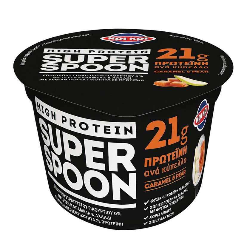 Το ΚΡΙ ΚΡΙ Super Spoon High Protein με γεύση καραμέλα και αχλάδι είναι ένα επιδόρπιο στραγγιστού γιαουρτιού 0% λιπαρών, εμπλουτισμένο με 21g φυσικής πρωτεΐνης ανά κύπελλο. Είναι χωρίς προσθήκη ζάχαρης, χρησιμοποιώντας γλυκαντικό από στέβια, και χωρίς λακτόζη, καθιστώντας το κατάλληλο για άτομα με δυσανεξία στη λακτόζη.