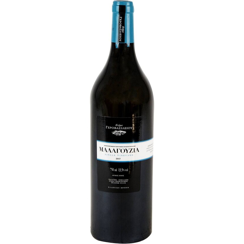 Οίνος λευκός Μαλαγουζιά ΚΤΗΜΑ ΓΕΡΟΒΑΣΙΛΕΙΟΥ ξηρός (750ml). Συνοδεύεται με πράσινες σαλάτες, κρύα ορεκτικά, οστρακοειδή, άπαχα πουλερικά με απλές σάλτσες, ριζότο με λαχανικά, αχνιστές γαρίδες, λευκά τυριά.