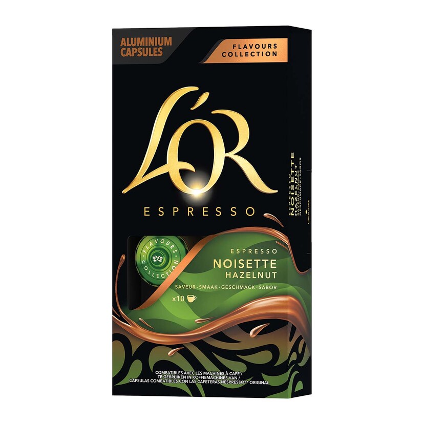 Κάψουλες espresso της εταιρίας L'Or, με άρωμα φουντούκι, Πρόκειται για καφέ espresso, αλεσμένο και τοποθετημένο σε καψουλα, κάτι που βοηθά στη σωστή αναλογία καφέ και νερού ώστε να φτιάξετε το τέλειο ρόφημα.