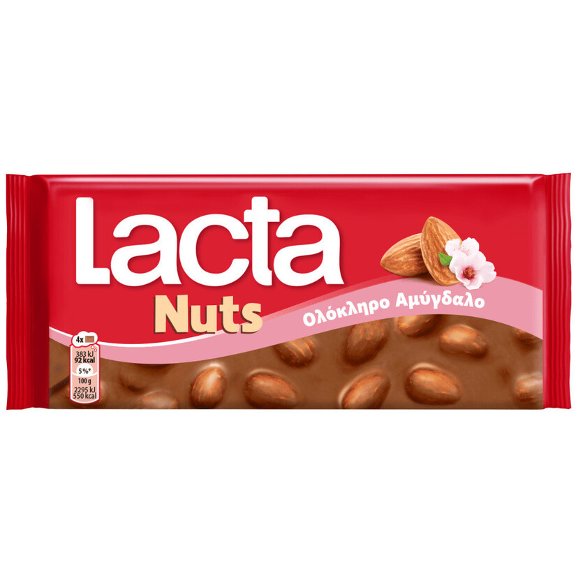 Η σοκολάτα γάλακτος Lacta με ολόκληρα αμύγδαλα 100g συνδυάζει την πλούσια, κρεμώδη γεύση της σοκολάτας γάλακτος με την τραγανή υφή των ολόκληρων αμυγδάλων, προσφέροντας μια απολαυστική εμπειρία σε κάθε μπουκιά.