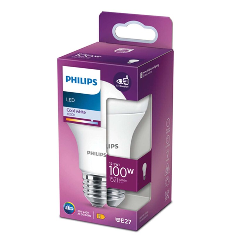 - Philips 8718699769925. Ισχύς λαμπτύρα: 12,5 W, Ισοδύναμη ισχύς λαμπτήρα: 100 W, Τοποθέτηση /καπάκι τύπου: E27, Φωτεινή ροή: 1521 lm, Διάρκεια ζωής λαμπτήρα: 15000 h, Χρώμα φωτός: Δροσερό λευκό, Θερμοκρασία χρώματος: 4000 K, Πλάτος γωνία: 200°, Color Rendering Index (CRI): 80,Συντελεστής ισχύος: 0,5