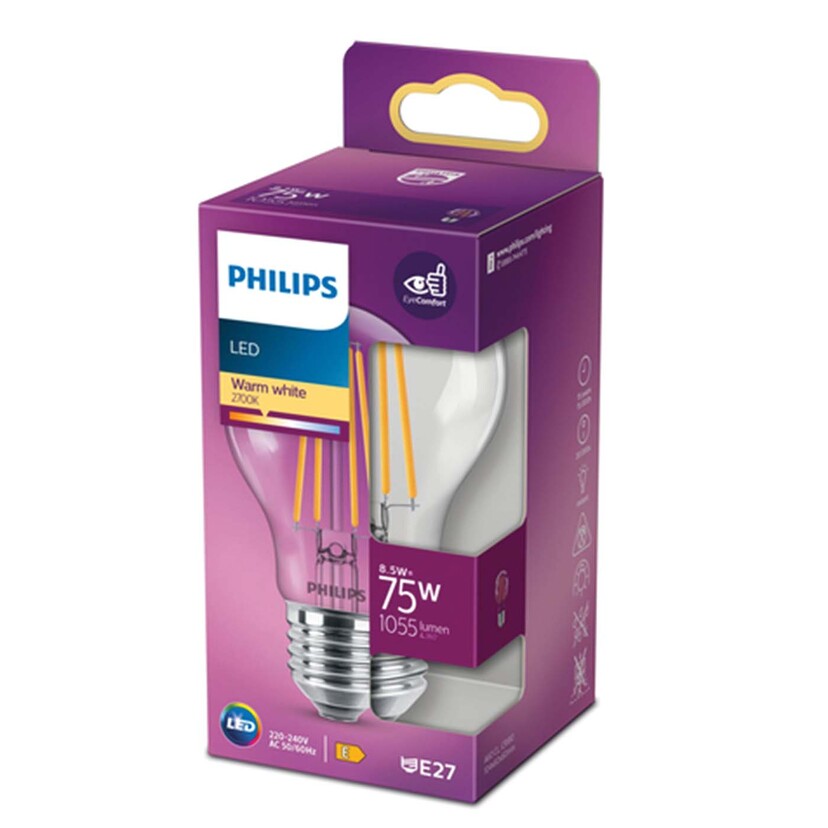 PHILIPS LED Λάμπα classic 75W E27 A60 θερμό φως , Philips 8718699762995. Ισχύς λαμπτύρα: 8,5 W, Ισοδύναμη ισχύς λαμπτήρα: 75 W, Τοποθέτηση / καπάκι τύπου: E27, Φωτεινή ροή: 1055 lm, Διάρκεια ζωής λαμπτήρα: 15000 h, Χρώμα φωτός: Θερμό λευκό, Θερμοκρασία χρώματος: 2700 K, Color Rendering Index (CRI): 80, Συντελεστής ισχύος: 0,52