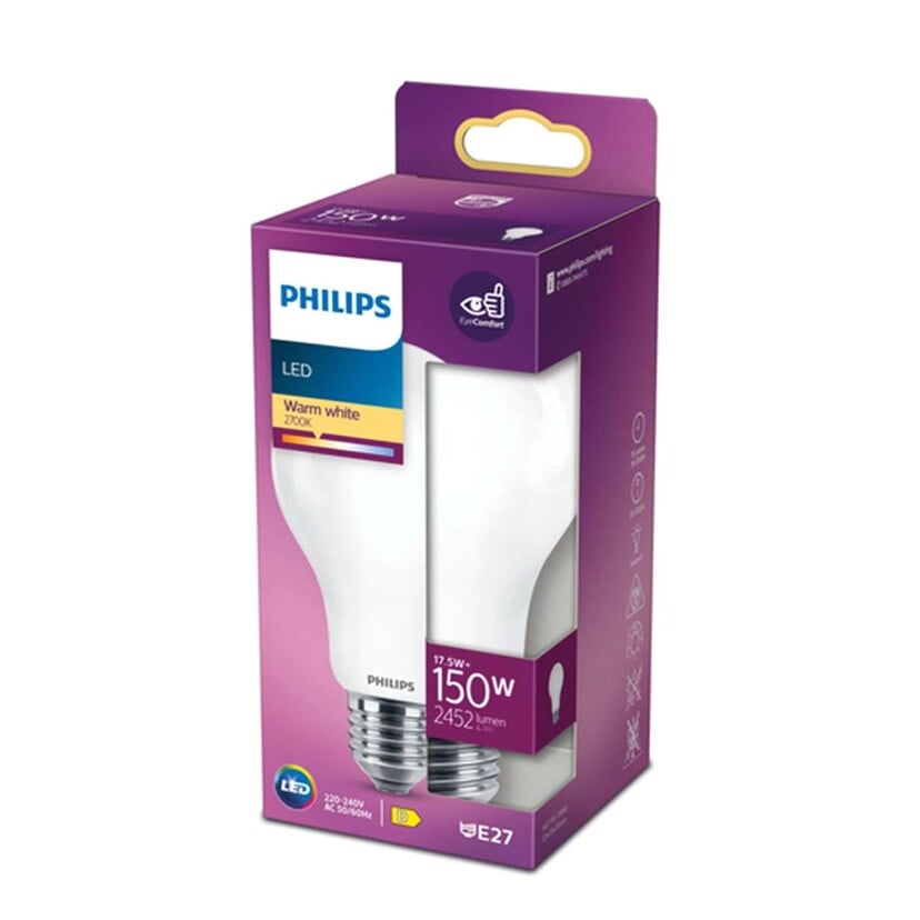 - Philips 8718699764579. Ισχύς λαμπτύρα: 17,5 W, Ισοδύναμη ισχύς λαμπτήρα: 150 W, Τοποθέτηση / καπάκι τύπου: E27, Φωτεινή ροή: 2452 lm, Διάρκεια ζωής λαμπτήρα: 15000 h, Χρώμα φωτός: Θερμόλευκό, Θερμοκρασία χρώματος: 2700 K, Color Rendering Index (CRI): 80, Συντελεστής ισχύος: 0,51
