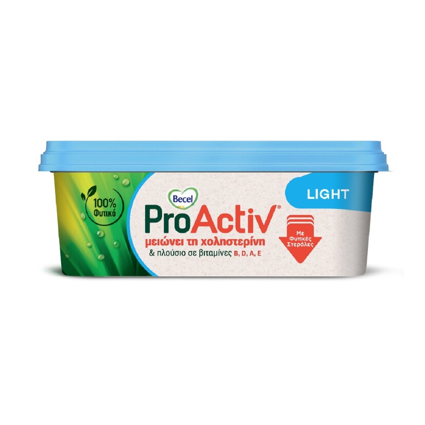 Το Becel ProActiv Light (250g) είναι ένα προϊόν επάλειψης με λιγότερα λιπαρά (σε σχέση με το Becel ProActiv Κλασικό) που είναι κλινικά αποδεδειγμένο ότι μειώνει αποτελεσματικά τη χοληστερίνη 7-10%, σε 2-3 εβδομάδες στα πλαίσια μιας ισορροπημένης διατροφής και ενός υγιεινού τρόπου ζωής. Λιπαρή ύλη για επάλειψη (spread), με 23% λιπαρά και προσθήκη φυτικών στερολών και βιταμινών. Πλούσιο σε βιταμίνες Α, Β1, Β2, Β6, Β12, D, E. Πηγή φολικού οξέος.