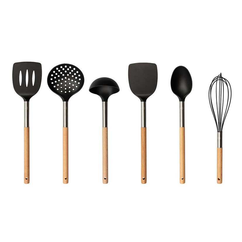Λειτουργικά εργαλεία μαγειρικής από ανθεκτικό στη θερμότητα νάιλον με μοντέρνες ξύλινες και ανοξείδωτες λαβές.