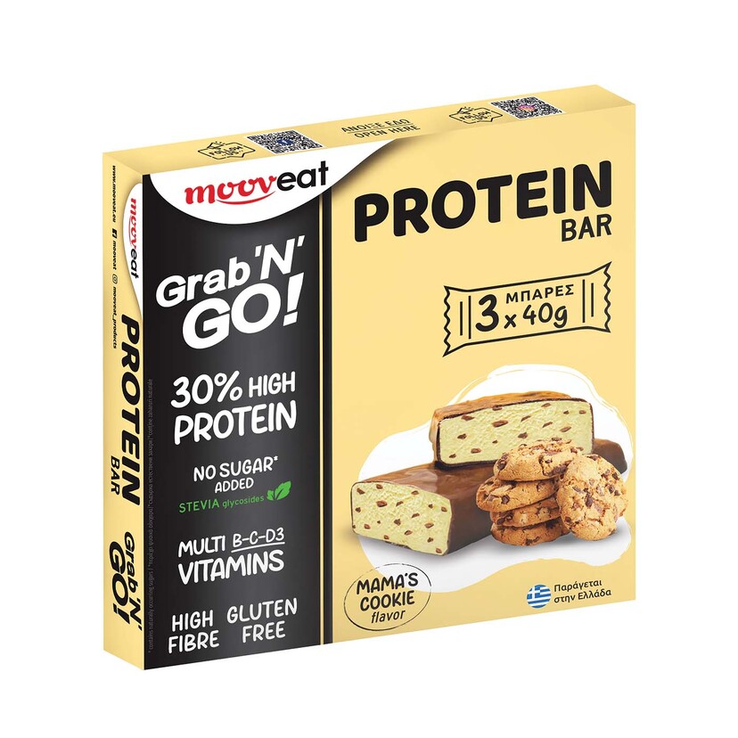 Η μπάρα πρωτεΐνης MOOVeat Grab N GO! Mama’s Cookie χωρίς προσθήκη ζάχαρης (με γλυκαντικά από το φυτό STEVIA), περιέχει 12 γραμμάρια πρωτεΐνης (30%) ανά μερίδα, είναι πλούσια σε φυτικές ίνες, χωρίς γλουτένη, ενώ κάθε μπάρα περιέχει το 25% της ημερήσιας συνιστώμενης ποσότητας 10 βιταμινών.