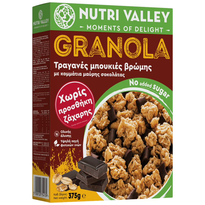 NUTRI VALLEY δημητριακά Granola με μαύρη σοκολάτα χωρίς προσθήκη ζάχαρης 375g