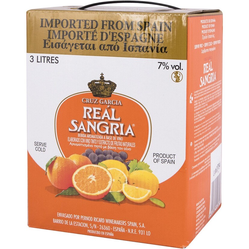 Οίνος ερυθρός Reál Sangria CRUZ GARCIA ημίγλυκος (3lt). Συνοδεύεται με tapas, πιάτα μεξικάνικης κουζίνας (takos, nachos), ξηρούς καρπούς, φρουτοσαλάτες, τάρτες φρούτων. Ιδανικό για απεριτίφ.