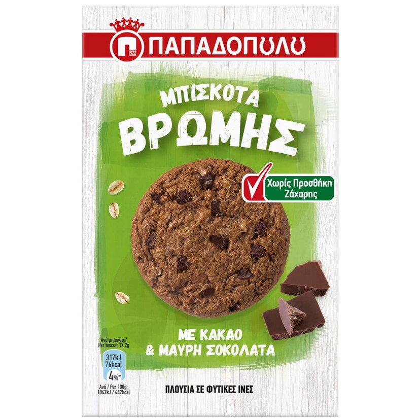 ΠΑΠΑΔΟΠΟΥΛΟΥ μπισκότα βρώμης με κακάο, σοκολάτα χωρίς ζάχαρη 155g