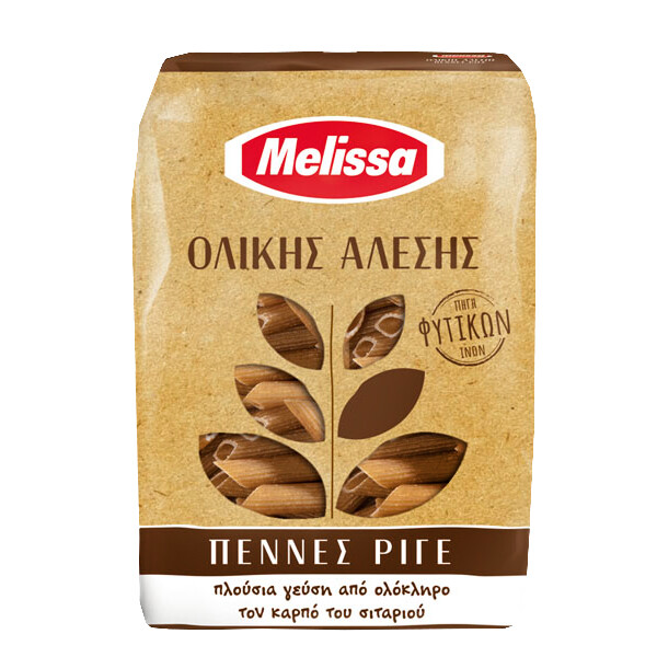 Πάστα ζυμαρικών MELISSA πέννες ολικής άλεσης (500g)Τα πιο αγαπημένα κοντά ζυμαρικά και με αλεύρι ολικής άλεσης για να απογειώνει συνταγές με κρέας ή λαχανικά.Τα ζυμαρικάMelissa Oλικής Aλέσης φέρνουν κοντά σας όλα τα οφέλη μιας υγιεινής και ισορροπημένης διατροφής. Έχουν πλούσια γεύση καθώς παρασκευάζονται από ολόκληρο τον καρπό του σιταριού και είναι πηγή φυτικών ινών. Αποτελούν πηγή πρωτεινών, πηγή φυτικών ινών και είναι χαμηλά σε λιπαρά. Χρόνος βρασμού 11-12 λεπτά. Πηγή φυτικών ινών, πηγή πρωτεϊνών, χαμηλά λιπαρά. Ελληνικά Ζυμαρικά.Τρόπος αποθήκευσης:Διατηρείται μέχρι την αναγραφόμενη ημερομηνία λήξης, εφόσον φυλάσσεται σε χώρο δροσερό και χωρίς υγρασία. Κακή συντήρηση σε αποθηκευτικούς χώρους είναι δυνατόν να προκαλέσει αλλοιώσεις.