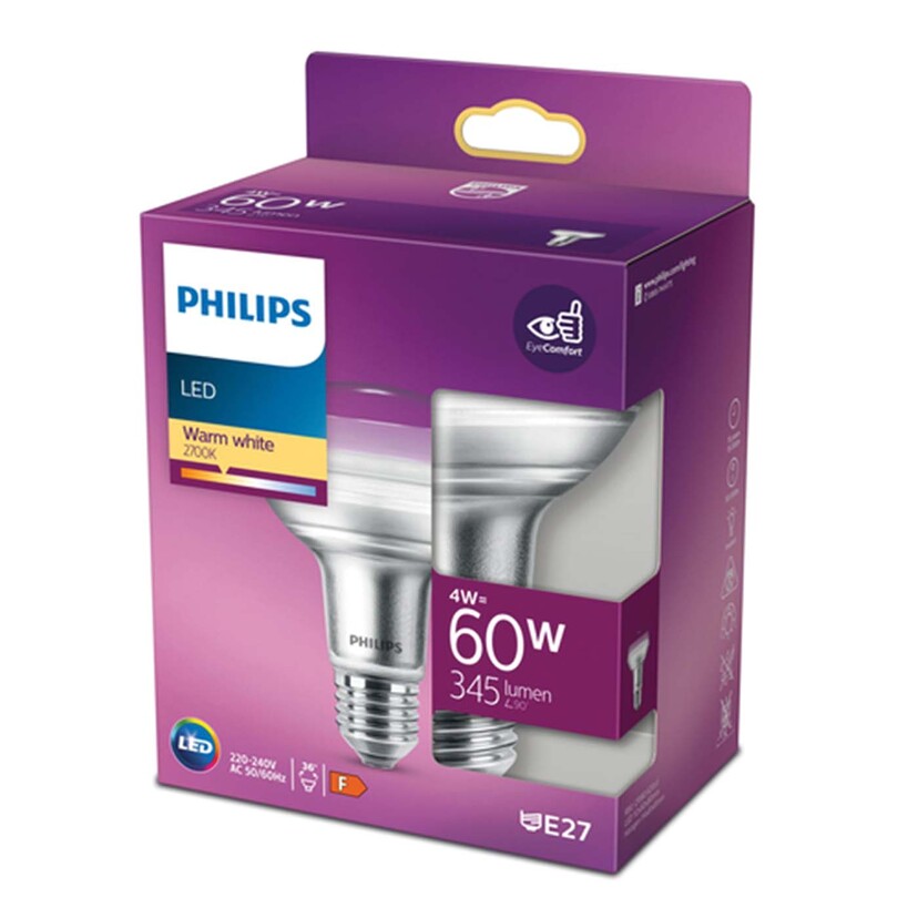 - Philips 8718699773854. Ισχύς λαμπτύρα: 4 W, Ισοδύναμη ισχύς λαμπτήρα: 60 W, Τοποθέτηση / καπάκι τύπου: E27, Φωτεινή ροή: 345 lm, Διάρκεια ζωής λαμπτήρα: 15000 h, Χρώμα φωτός: Θερμό λευκό, Θερμοκρασία χρώματος: 2700 K, Πλάτος γωνία: 36°, Color Rendering Index (CRI): 80, Συντελεστής ισχύος: 0,5