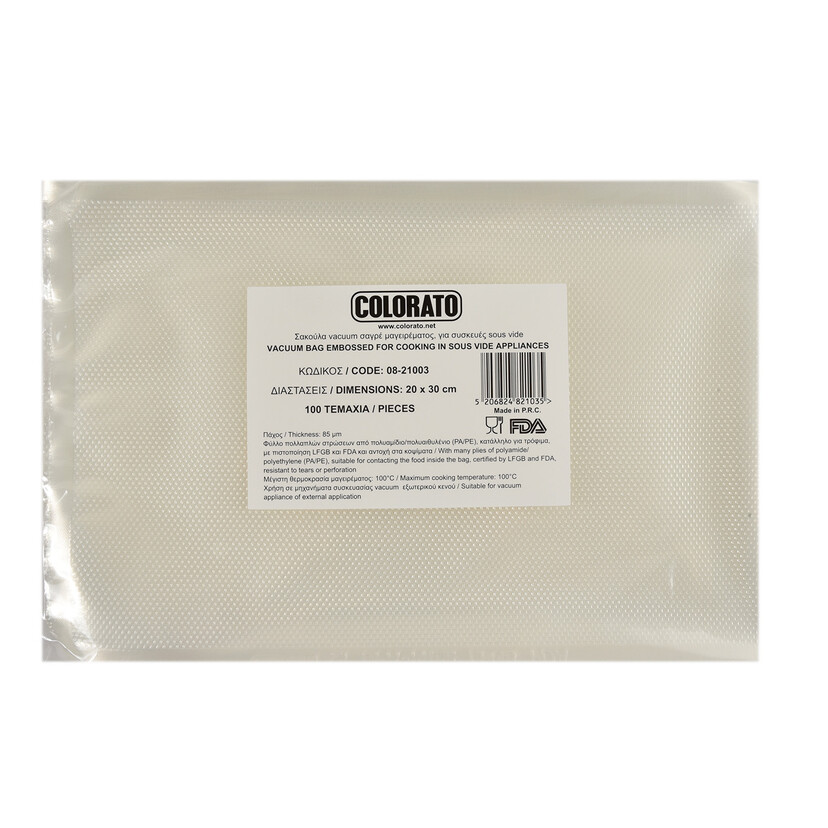Σακούλες vacuum σαγρέ εξωτερικού κενού 20x30cm 100τεμ. Σακούλες vacuum υψηλής ποιότητας, κατάλληλες για συσκευασία τροφίμων και επαγγελματική χρήση. Χαρακτηριστικά Επιφάνεια: σαγρέ (ανάγλυφη) Τύπος: εξωτερικού κενού Διαστάσεις: 20x30cm Πάχος: 85 μm