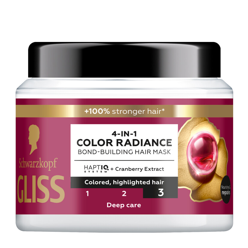 Μάσκα με σύστημα HAPTIQ. Προστασία χρώματος για έως και 13 εβδομάδες & λαμπερό χρώμα με διάρκεια.** Εντατική επανόρθωση μαλλιών. Με αναζωογονητικό φρουτώδες άρωμα. **σε συνδυασμό με το Σαμπουάν Colour Perfector Schwarzkopf Gliss 4-In-1 Color Radiance Bond-Building Μάσκα Μαλλιών 400ml - Μάσκα μαλλιών για βαμμένα, με ανταύγειες μαλλιά Τα βαμμένα μαλλιά χάνουν τη ζωντάνια τους με το συχνό λούσιμο. Χρειάζεται ειδική προστασία για να διατηρήσουν το έντονο χρώμα και τη φωτεινότητά τους. Αυτή η μάσκα Gliss συνδυάζει το σύστημα HAPTIQ και το εκχύλισμα cranberry για να προσφέρει βαθιά επανόρθωση στα μαλλιά, προστασία χρώματος έως και 13 εβδομάδες και λαμπερό χρώμα με διάρκεια*. Με την ελαφριά κρεμώδη υφή της παρέχει βαθιά θρέψη, ενώ αφήνει τα μαλλιά λαμπερά, με υγιή όψη χωρίς να τα βαραίνει. Gliss Care Level: 3 - Εντατική φροντίδα, με φόρμουλες επανόρθωσης και συστατικά υψηλής απόδοσης. Αυτή η μάσκα μαλλιών Gliss με το σύστημα HAPTIQ δημιουργεί μικροδεσμούς και ενισχύει τη δομή της τρίχας. Για όμορφα μαλλιά με αποτέλεσμα που μπορείς να δεις και να αισθανθείς.