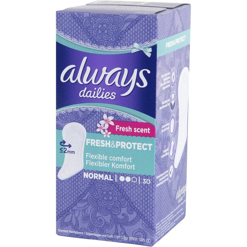 Νιώσε φρέσκια και καθαρή όλη μέρα με τα Σερβιετάκια Always Dailies Fresh & Protect Normal fresh με άρωμα. Με τεχνολογία που εξουδετερώνει τις οσμές και απορροφητικές ζώνες για καθημερινή προστασία. Ιδανικά για κολπικές εκκρίσεις ή ως επιπλέον προστασία για ακανόνιστες περιόδους.