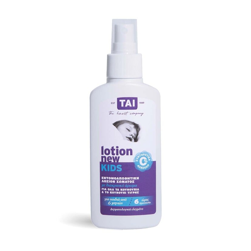 Η εντομοαπωθητική lotion σε spray TAI new lotion kids IR3535 10% είναι ιδανική για ενήλικες και μωρά από 6 μηνών. Διατίθεται σε μπουκάλι 100ml με βαλβίδα spray που ψεκάζει και ανάποδα (upside down), έχει πολύ διακριτικό και ευχάριστο άρωμα, με 0% συντηρητικά και 0% αλκοόλη. Τέλος έχει Ευρωπαϊκή Έγκριση Κυκλοφορίας βάσει ΕΥΡΩΠΑΙΚΟΥ ΚΑΝΟΝΙΣΜΟΥ BPR* (κανονισμός ΕΕ 528/2012 βιοκτόνων προϊόντων).
