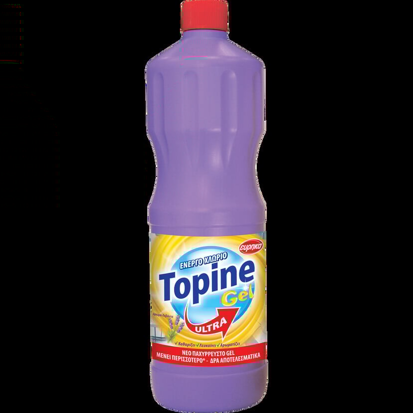 Το ενεργό χλώριο Topine Gel Ultra στην παχύρρευστη μορφή gel, μένει και δρα περισσότερο ακόμα και στις πιο δύσκολες, κάθετες επιφάνειες όπως πχ λεκάνη τουαλέτας, για εξαιρετικά αποτελέσματα! Καθαρίζει, λευκαίνει και αρωματίζει πλακάκια, νεροχύτες, είδη υγιεινής, επιφάνειες εμαγιέ, φορμάικα, μάρμαρα, μωσαϊκά κλπ.